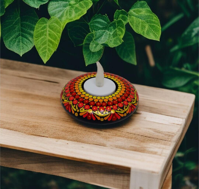 Son design circulaire est orné de motifs colorés et raffinés, inspirés de l’art traditionnel, avec des touches de rouge, jaune et orange qui apportent une ambiance festive et chaleureuse.