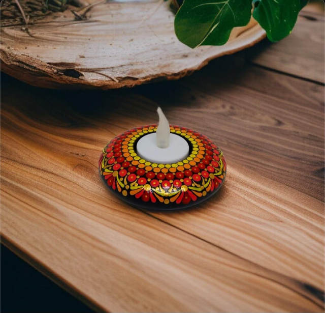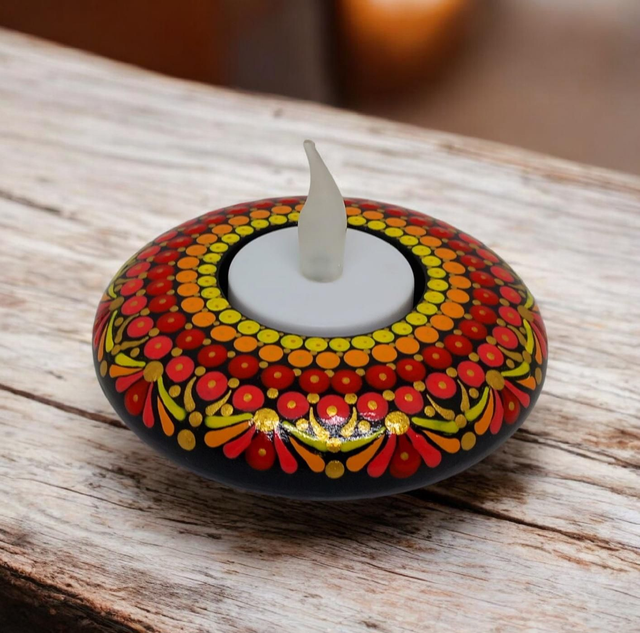 Ce bougeoir en bois, peint à la main, mesure 9 cm de diamètre et 1,5 cm de hauteur.
