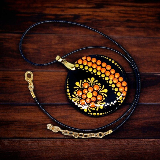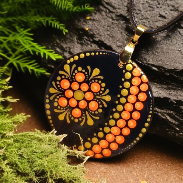 Son mandala aux coloris orange et or, peint avec minutie, inspire la tranquillité et l'harmonie.