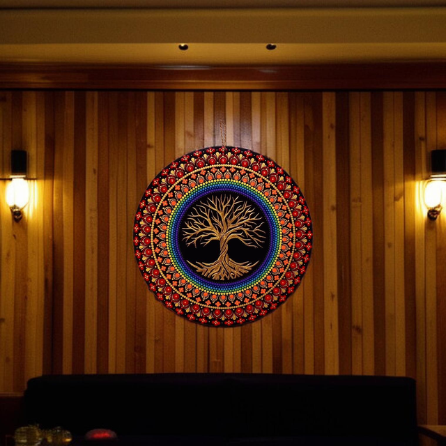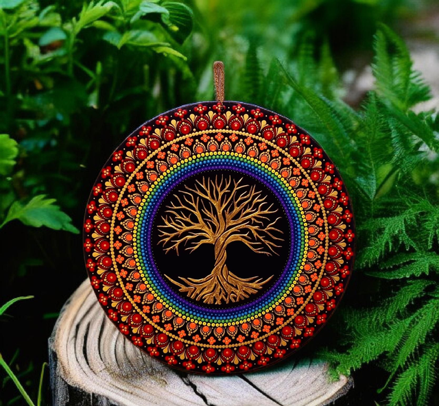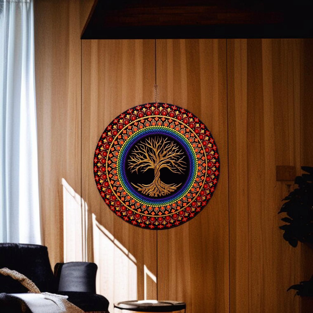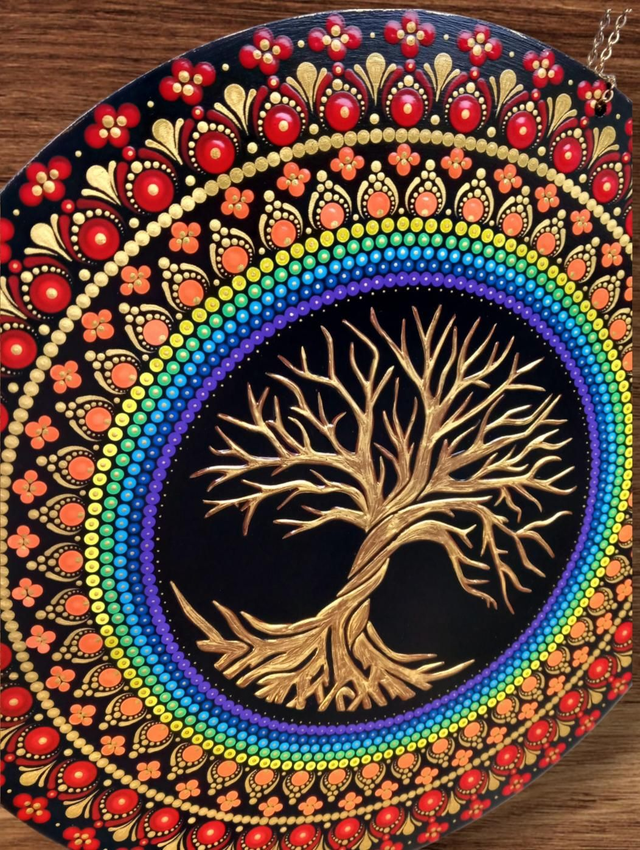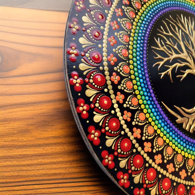 Multicolore, ce tableau a été méticuleusement peint sur une plaque de bois MDF ronde.