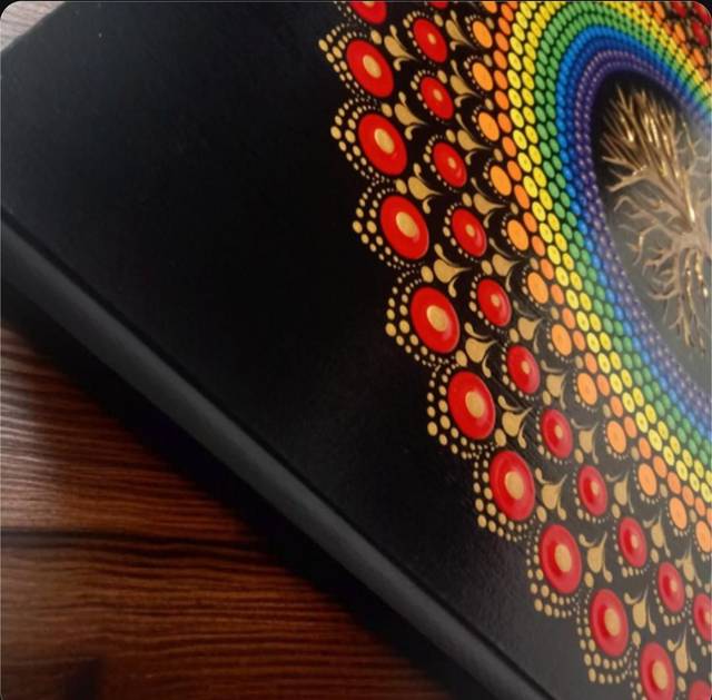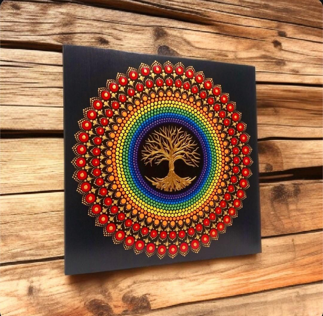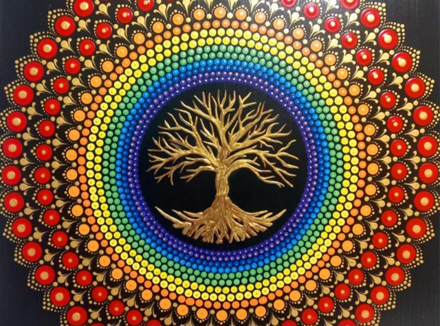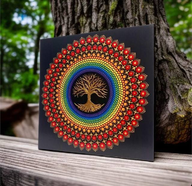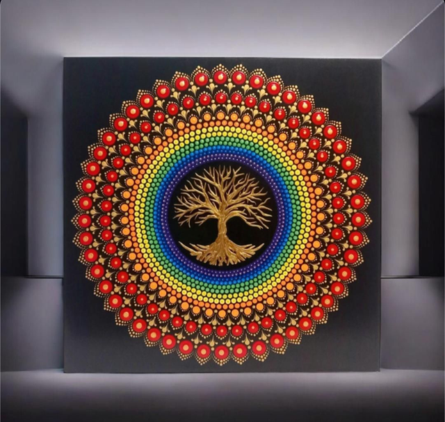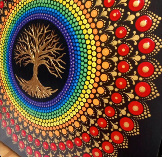 Peint à la main point par point selon la technique du pointillisme, l'arbre de vie de couleur or crée un effet 3D grâce à son épaisseur.