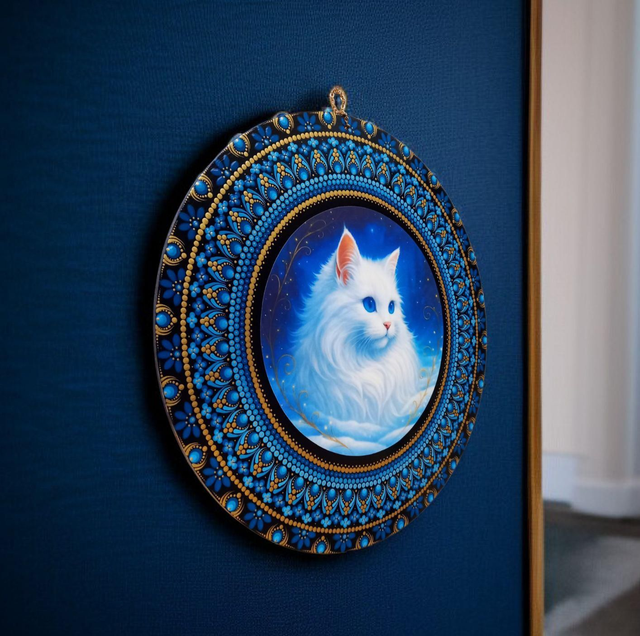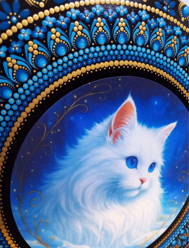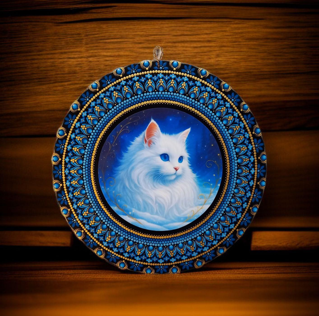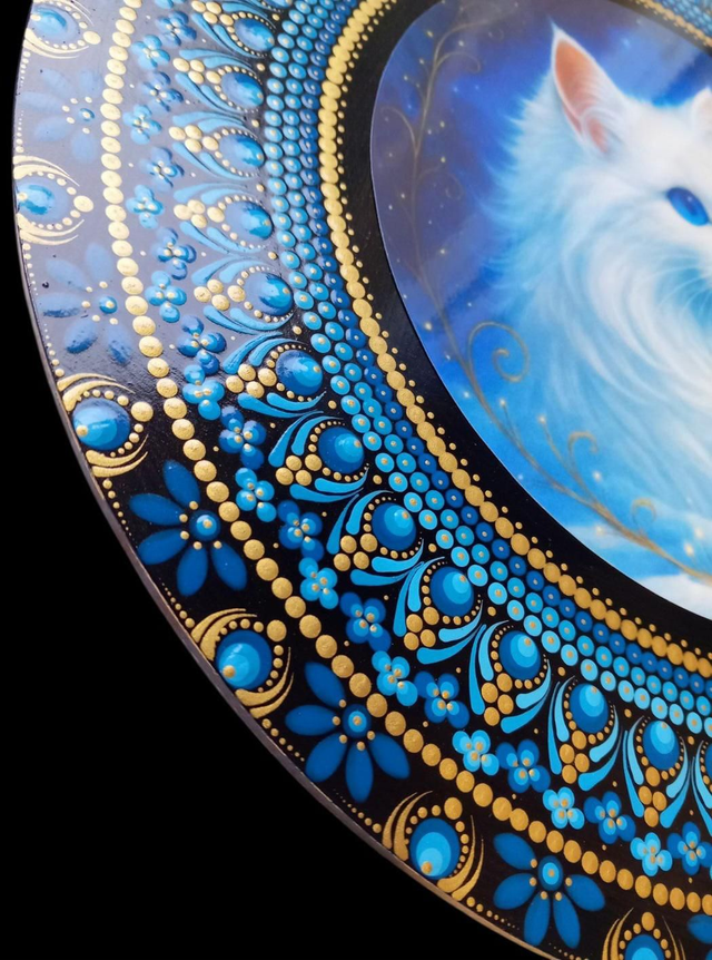 De coloris bleu et or, ce mandala réalisé à la technique du pointillisme, à été méticuleusement peint sur une plaque de bois MDF ronde de 30 cm de diamètre.
