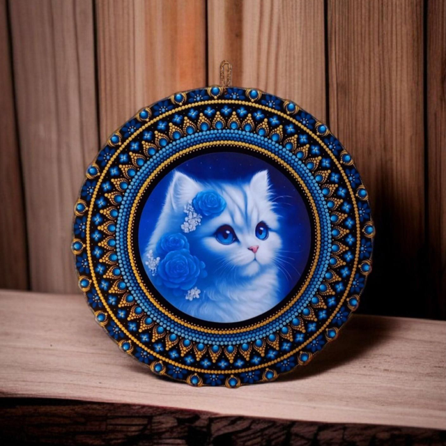 De coloris bleu et or, ce mandala réalisé à la technique du pointillisme, à été méticuleusement peint sur une plaque de bois MDF ronde de 30 cm de diamètre.
