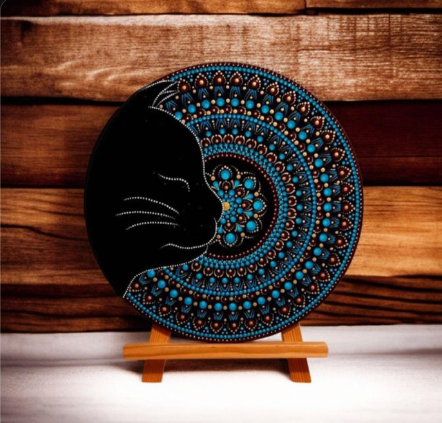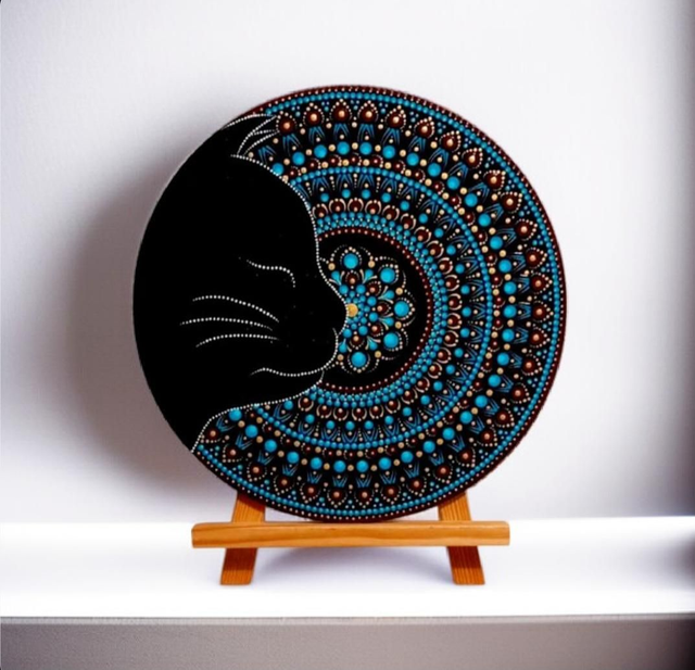 De coloris noir, turquoise et or, ce tableau a été méticuleusement peint sur une plaque de bois MDF ronde.