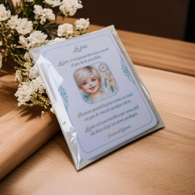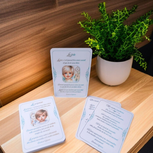 Chaque carte illustre un visage exprimant une émotion, pour aider l’enfant à reconnaître ce qu’il ressent et à mettre des mots dessus, simplement et naturellement.