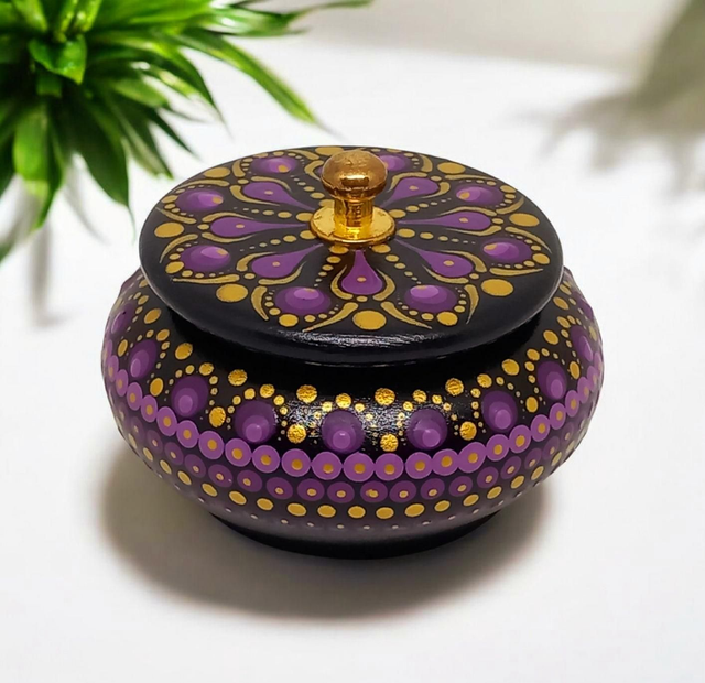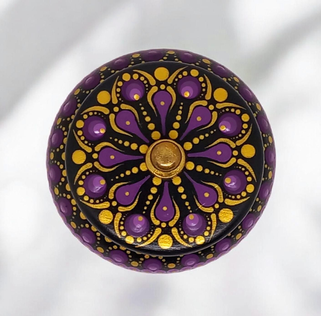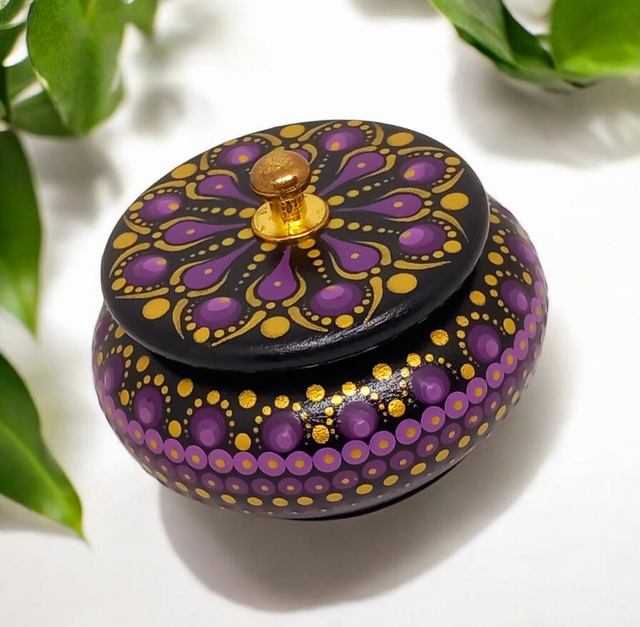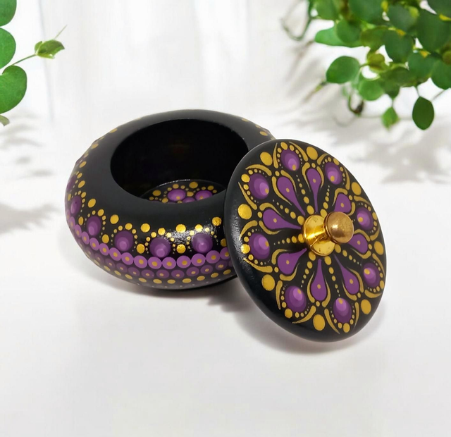 Cette magnifique boîte ronde est peinte à la main dans des tons noir, violet et or, pour un look élégant et sophistiqué.