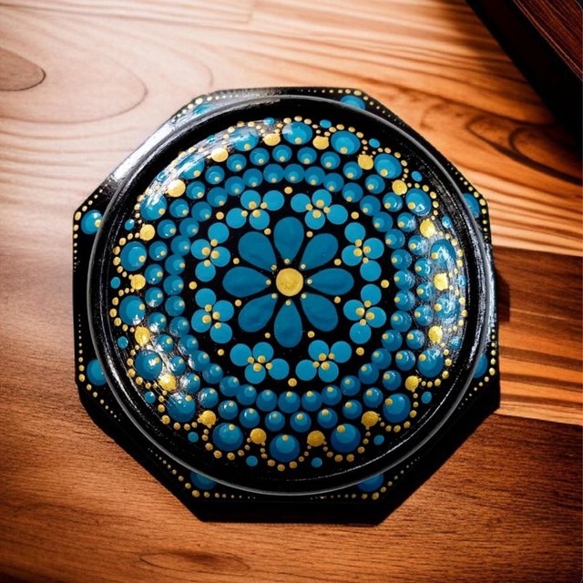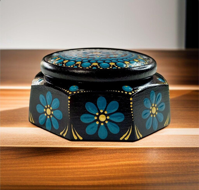 Peinte à la main dans des tons turquoise et or, cette élégante boîte ronde offre un style à la fois raffiné et original.