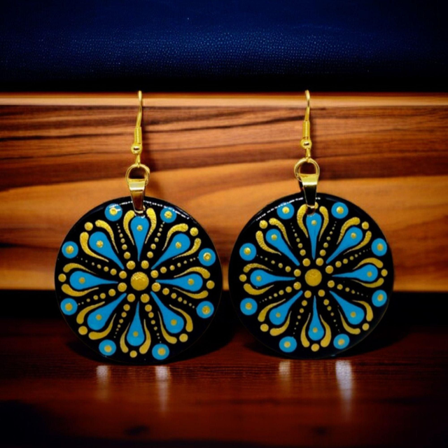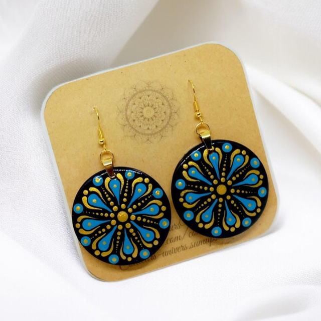 Mettez de la couleur dans votre vie avec ces sublimes boucles d'oreilles bleues en bois et acier inoxydable, peintes à la main des deux côtés pour un look unique!